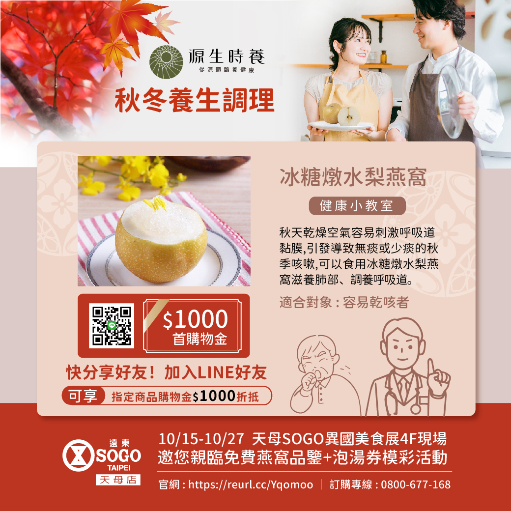 | 內 容 | 來自世界級雨林的【源生時養】,是台灣近年崛起的頂級燉煮燕窩精品品牌;源生時養專注於從源頭韜養健康,嚴選雨林產地給您滿滿的營養,不計成本搭建五星級燕屋的環境給您食安的保障,擁有獨家專利的【月滿燕】燕窩產品,由源頭極品官燕盞(最高等級,最純淨稀有)製成、突破費時挑毛清洗等繁複統燉煮燕窩工序、創新烹調方便快速、超過15道嚴格品管流程,且通過各項SGS品質認證,深受頂級客戶與金字塔頂端消費客層的歡迎。 【來自雨林滋補的真情邀約,10/15-10/27一起到天母SOGO享好康品嘗專利頂級燕窩】 秋去冬來,天氣轉涼,滋潤調理正當時。選擇燕窩,用溫潤呵護每一天,讓你在換季時節保持水潤舒適,擁抱健康好氣色! 疼愛自己也為珍愛的家人朋友,親手烹調愛的燕窩,展現真情意! 適逢雙十,源生時養將於10/15起至10/27在天母SOGO 4樓【異國風情美食用品展】現場舉辦為期13天的【金秋滋補-煥活養生】頂級燕窩品嘗暨$1000首購金活動;源生時養將首次展出頂級專利月滿燕燕窩禮盒系列組、及舉辦現場【頂級專利月滿燕免費品鑒】(每日20名)、摩天輪試手氣購物搭贈【頂級雨林蜂蜜罐】、知名品牌【櫻桃爺爺】核桃糕及【美食天王-陳鴻著書”美食散步”】、【英國正版彼得兔】系列商品抽獎等;現場加入LINE好友立即享有【$1000】首購金折抵,凡現場購物者還可參加摸彩活動,於活動結束後抽出獲獎者、幸運兒可獲贈知名飯店《限量-海洋溫泉券》一張,活動與獎品設計都非常精彩可期,歡迎大家把握難得機會、蒞臨品嘗選購! 為迎接年底送禮熱潮與因應秋冬季節來臨,源生時養特別企劃推出【頂級專利月滿燕二入超體驗組$1900】限量組(搭配現場首購金$1000折抵)及《愛-幸福頂級燕窩15入+贈世界頂級蜂蜜罐禮盒一組》$14,750(搭配首購金$1000折抵),秋冬養生與呼吸道保養選用頂級專利燕窩(#不用挑毛、簡單烹調、#食安看得見)親手燉煮給家人朋友表達關懷與愛意、正是最佳時節! 【至臻品質,源頭掌控】 這一份來自【源生時養】的真情邀約,源自於源生時養對家人最初的鍾愛與對食安的堅持;『源生時養』遠赴世界第三大島加里曼丹島之國家森林公園,這裡有